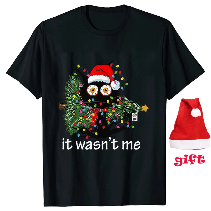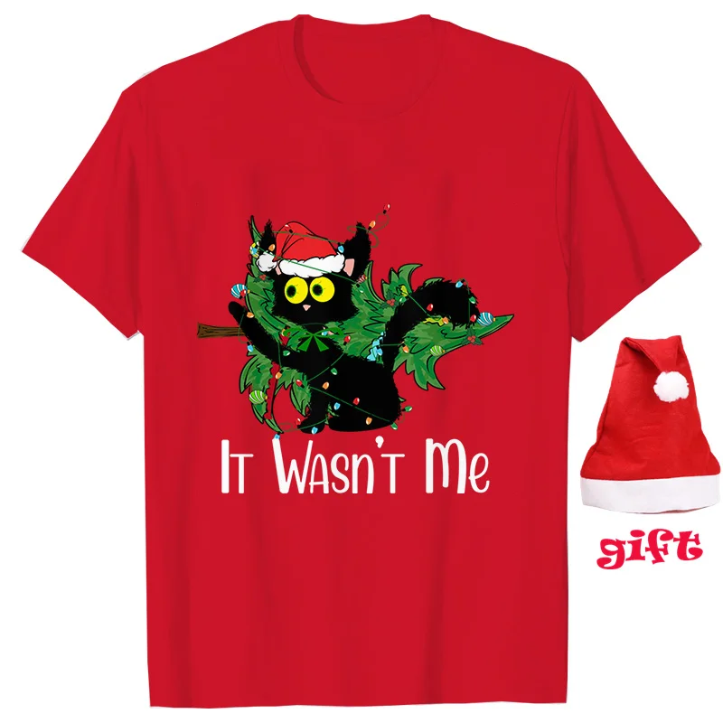 It Wasn's Me Christmas Cat Female Clothing Xmas Tree Casual Fashion Party Short Sleeve Women T-Shirts with Christmas Hats